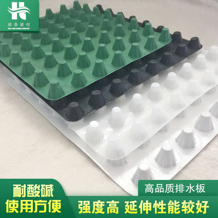 圓錐突臺(tái)的頂面膠接一層過濾土工布,以阻止泥土微粒通過,從而避免排水通道阻塞使孔道排水順暢。 傳統(tǒng)的排水方式使用磚石瓦塊作為導(dǎo)濾層、使用較多的鵝卵石或碎石作為濾水層、將水排到指定地點(diǎn)。而用排水板取代鵝卵石濾水層來排水則省時(shí)、省力又節(jié)能、節(jié)省投資、還能降低建筑物的荷載。